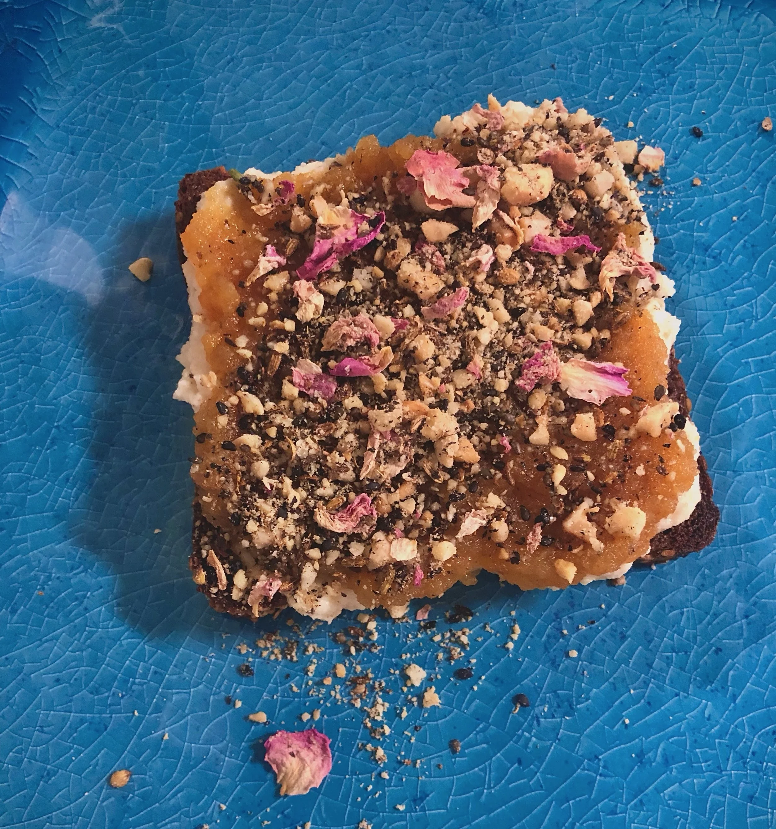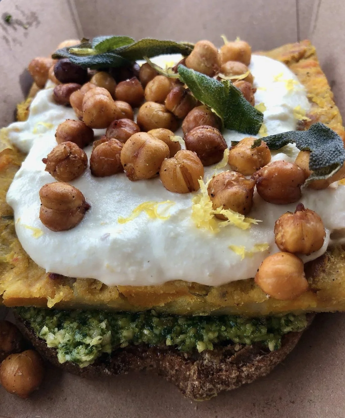 Local squash and leeks, toasted sunflower see and sage pesto, preerved Meyer lemon cashew cream, crispy chickpeas and fried age on a toasted slice of Muddy Fork bread
