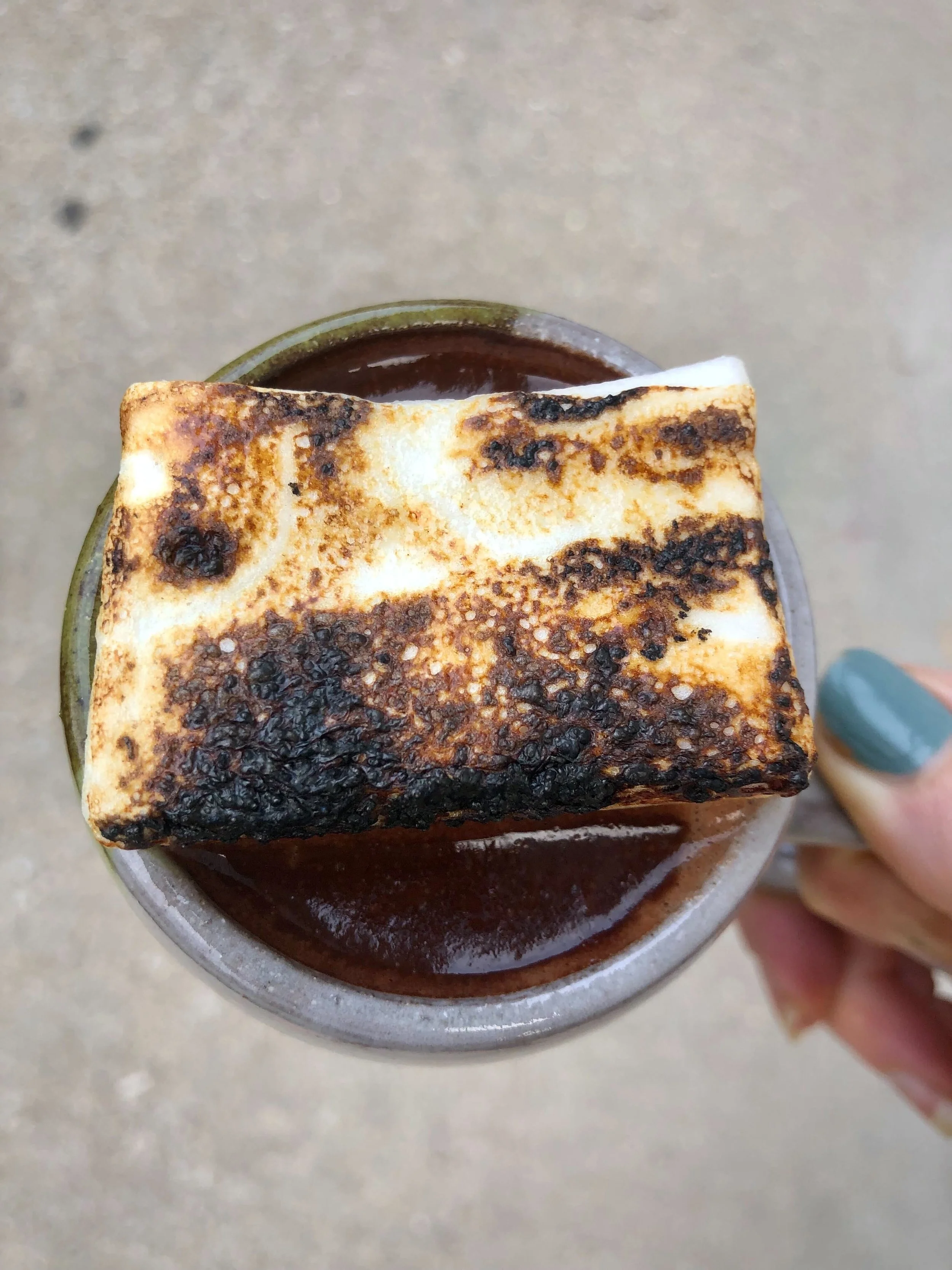 Our own everything from scratch chocolate elixir (think Polar Express hot chocolate as thick as melted chocolate bars) with a plant-based marshmallow toasted to order.